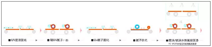 水泥纖維板------水性底漆------水性中涂漆------水性氟碳涂料----烘烤----包裝。